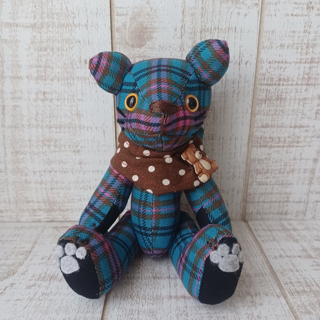 【サイズと仕様】 身長:約18cm 目玉:プラスチックアイ ジョイント:ボタンジョイント(4ジョイント/手足が可動します) ボディ素材:コットンリネン 詰め綿(国産) ※服は縫い付けのため着せ替えはできません。 【作品について】 メインの作品はテディベアですが、猫好きなお客様からのリクエストに応えて「おともだちのネコさん」を作りました。 テディベアの魅力はそのままにネコにアレンジ。 ボディにはオリジナルのチェック生地を使用して、他にはない作品に仕上げました。 【ラッピング】 基本的に透明のラッピング袋に作品を入れて麻紐リボンで結んでお届けしております。 プレゼント用にご購入のお客様は備考欄にメッセージを入れていただくとサテンリボンで対応可能です。 但し、リボンの素材や色はこちらにお任せください。 【発送について】 通常はお支払い確認後、翌営業日に出荷対応しております。(遅くとも3営業日内に出荷) 発送方法は当店にお任せでお願いしております。 基本的には配達日時指定できません。 お届け日にご不在の場合は、不在票に記載の配送会社へご連絡いただき、預かり期限内にお受け取りをお願いいたします。 預かり期限を超過した場合は【ゆうパック(送料着払い)】での再送となりますので、何卒ご了承ください。 どうしてもお届け日時の指定が必要なお客様は【ゆうパック(送料着払い)】での対応となります。 その場合、送料無料の該当商品をご購入の場合でも送料は全額お客様ご負担となります。 こちらの内容でご了承いただきましたら、ご注文の前にメッセージでご連絡をお願いいたします。 【お手入れとご注意】 お手に触れる回数が増えると劣化の原因となります。 小さなパーツを使用しているため、お子様の使用はくれぐれもご注意ください。 乳幼児の枕元には絶対に置かないようにしてください。 洗濯はお薦めしておりません。万が一汚れた場合は固く絞ったタオルで拭き、自然乾燥させてください。 直射日光は布地の色あせやパーツの劣化・破損の原因となります。特に車内など高温になる場所での保管は避けてください。 当店では、おうちが決まる前のテディベアたちはホコリが付かないようガラスのショーケースに入れて保管しております。お客様のもとへお届けするまで定期的にケースの扉を開けて風通しを良くするなどしてお手入れしております。ご参考になさってください。 【メッセージ】 「カッコかわいい」をテーマに、世界に一つだけのテディベアを製作して販売しております。 他にはない個性的なテディベアは年齢性別問わず多くのファンの方にお迎えいただいております。 名前があるとさらに愛着がわきます。素敵な名前を付けていただけたら嬉しいです。 【取扱店舗】 ※下記の店舗以外は偽サイトの可能性がありますのでご注意ください※ BASE SHOP minne Creema リベシティ市場 メルカリShops(送料を加算した価格での販売となります) コラボ中のショップ様(コラボ作品に限る)