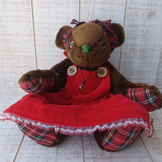 【サイズと仕様】 身長:約28cm 目玉:プラスチックアイ ジョイント:プラスチックジョイント(5ジョイント/手足と首が可動します) ボディ素材:エコファー 詰め綿(国産) ※服は縫い付けのため着せ替えはできません。 【作品について】 かわいいガーリーテイストのテディベア。 肌ざわりの良いファー生地を使用。 真っ赤なベロアのワンピースには贅沢にレースを使いました。 いちごモチーフのリボンやチャームでコーディネートし、足裏と手のひらには赤いタータンチェック生地をセレクトしています。 こちらの作品は【闘病中の子どもたちにテディベアを贈ろうプロジェクト】の対象作品となっております。 売り上げから必要経費を差し引いた全額を子供たちへ寄贈するテディベアの製作費や活動費に使わせていただきます。 【ラッピング】 基本的に透明のラッピング袋に作品を入れて麻紐リボンで結んでお届けしております。 プレゼント用にご購入のお客様は備考欄にメッセージを入れていただくとサテンリボンで対応可能です。 但し、リボンの素材や色はこちらにお任せください。 【発送について】 通常はお支払い確認後、翌営業日に出荷対応しております。(遅くとも3営業日内に出荷) 発送方法は当店にお任せでお願いしております。 基本的には配達日時指定できません。 お届け日にご不在の場合は、不在票に記載の配送会社へご連絡いただき、預かり期限内にお受け取りをお願いいたします。 預かり期限を超過した場合は【ゆうパック(送料着払い)】での再送となりますので、何卒ご了承ください。 どうしてもお届け日時の指定が必要なお客様は【ゆうパック(送料着払い)】での対応となります。 その場合、送料無料の該当商品をご購入の場合でも送料は全額お客様ご負担となります。 こちらの内容でご了承いただきましたら、ご注文の前にメッセージでご連絡をお願いいたします。 【お手入れとご注意】 お手に触れる回数が増えると劣化の原因となります。 小さなパーツを使用しているため、お子様の使用はくれぐれもご注意ください。 乳幼児の枕元には絶対に置かないようにしてください。 洗濯はお薦めしておりません。万が一汚れた場合は固く絞ったタオルで拭き、自然乾燥させてください。 直射日光は布地の色あせやパーツの劣化・破損の原因となります。特に車内など高温になる場所での保管は避けてください。 当店では、おうちが決まる前のテディベアたちはホコリが付かないようガラスのショーケースに入れて保管しております。お客様のもとへお届けするまで定期的にケースの扉を開けて風通しを良くするなどしてお手入れしております。ご参考になさってください。 【メッセージ】 「カッコかわいい」をテーマに、世界に一つだけのテディベアを製作して販売しております。 他にはない個性的なテディベアは年齢性別問わず多くのファンの方にお迎えいただいております。 名前があるとさらに愛着がわきます。素敵な名前を付けていただけたら嬉しいです。 【取扱店舗】 ※下記の店舗以外は偽サイトの可能性がありますのでご注意ください※ BASE SHOP minne Creema リベシティ市場 メルカリShops(送料を加算した価格での販売となります) コラボ中のショップ様(コラボ作品に限る)