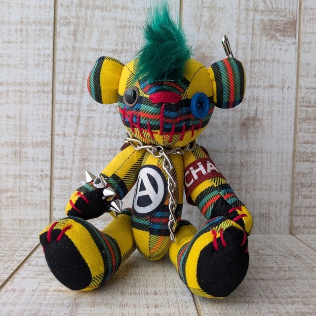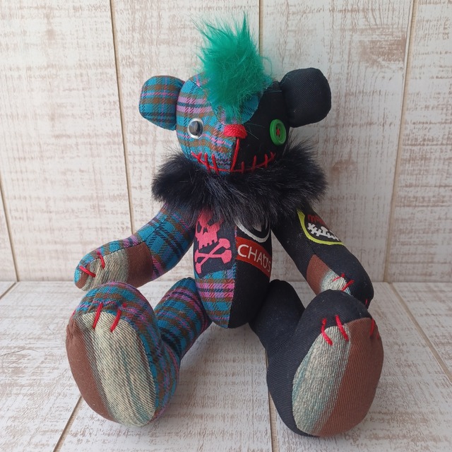 【サイズと仕様】 身長:約18cm(モヒカン部分はサイズに含みません) 目玉:プラスチックアイ ジョイント:ボタンジョイント(4ジョイント/手足が可動します) ボディ素材:コットンリネン 詰め物:綿(国産) ※服は縫い付けのため着せ替えはできません。 【作品について】 緑のモヒカンヘアが目を惹く個性いっぱいのテディベア。 ボディにはオリジナルのチェック生地を使用しました。 片目はボタン、口元には縫い目でポップでちょっとホラーな”怖カワイイ”デザイン。 特注の腕章や布パッチで装飾して他にはない作品に仕上げました。 【ラッピング】 基本的に透明のラッピング袋に作品を入れて麻紐リボンで結んでお届けしております。 プレゼント用にご購入のお客様は備考欄にメッセージを入れていただくとサテンリボンで対応可能です。 但し、リボンの素材や色はこちらにお任せください。 【発送について】 通常はお支払い確認後、翌営業日に出荷対応しております。(遅くとも3営業日内に出荷) 発送方法は当店にお任せでお願いしております。 基本的には配達日時指定できません。 お届け日にご不在の場合は、不在票に記載の配送会社へご連絡いただき、預かり期限内にお受け取りをお願いいたします。 預かり期限を超過した場合は【ゆうパック(送料着払い)】での再送となりますので、何卒ご了承ください。 どうしてもお届け日時の指定が必要なお客様は【ゆうパック(送料着払い)】での対応となります。 その場合、送料無料の該当商品をご購入の場合でも送料は全額お客様ご負担となります。 こちらの内容でご了承いただきましたら、ご注文の前にメッセージでご連絡をお願いいたします。 【お手入れとご注意】 お手に触れる回数が増えると劣化の原因となります。 小さなパーツを使用しているため、お子様の使用はくれぐれもご注意ください。 乳幼児の枕元には絶対に置かないようにしてください。 洗濯はお薦めしておりません。万が一汚れた場合は固く絞ったタオルで拭き、自然乾燥させてください。 直射日光は布地の色あせやパーツの劣化・破損の原因となります。特に車内など高温になる場所での保管は避けてください。 当店では、おうちが決まる前のテディベアたちはホコリが付かないようガラスのショーケースに入れて保管しております。お客様のもとへお届けするまで定期的にケースの扉を開けて風通しを良くするなどしてお手入れしております。ご参考になさってください。 【メッセージ】 「カッコかわいい」をテーマに、世界に一つだけのテディベアを製作して販売しております。 他にはない個性的なテディベアは年齢性別問わず多くのファンの方にお迎えいただいております。 名前があるとさらに愛着がわきます。素敵な名前を付けていただけたら嬉しいです。 【取扱店舗】 ※下記の店舗以外は偽サイトの可能性がありますのでご注意ください※ BASE SHOP minne Creema リベシティ市場 メルカリShops(送料を加算した価格での販売となります) コラボ中のショップ様(コラボ作品に限る)