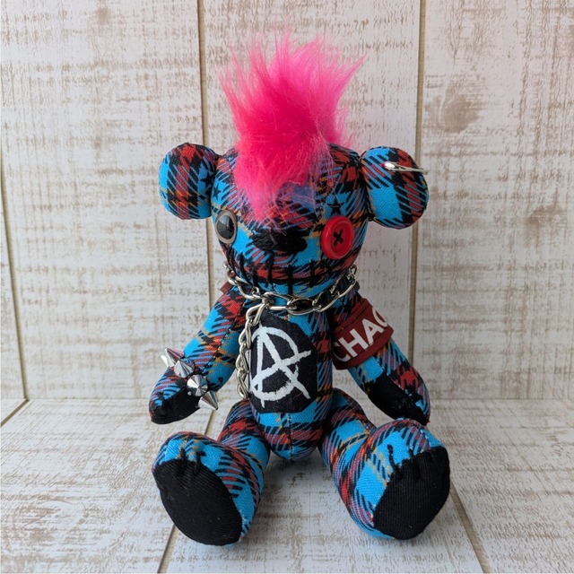 【サイズと仕様】 身長:約18cm(モヒカン部分はサイズに含みません) 目玉:プラスチックアイ ジョイント:ボタンジョイント(4ジョイント/手足が可動します) ボディ素材:コットンリネン 詰め物:綿(国産) ※服は縫い付けのため着せ替えはできません。 【作品について】 ピンクのモヒカンヘアが目を惹く個性いっぱいのテディベア。 ボディにはオリジナルのチェック生地を使用しました。 片目はボタン、口元には縫い目でポップでちょっとホラーな”怖カワイイ”デザイン。 特注の腕章や布パッチで装飾して他にはない作品に仕上げました。 【ラッピング】 基本的に透明のラッピング袋に作品を入れて麻紐リボンで結んでお届けしております。 プレゼント用にご購入のお客様は備考欄にメッセージを入れていただくとサテンリボンで対応可能です。 但し、リボンの素材や色はこちらにお任せください。 【発送について】 通常はお支払い確認後、翌営業日に出荷対応しております。(遅くとも3営業日内に出荷) 発送方法は当店にお任せでお願いしております。 基本的には配達日時指定できません。 お届け日にご不在の場合は、不在票に記載の配送会社へご連絡いただき、預かり期限内にお受け取りをお願いいたします。 預かり期限を超過した場合は【ゆうパック(送料着払い)】での再送となりますので、何卒ご了承ください。 どうしてもお届け日時の指定が必要なお客様は【ゆうパック(送料着払い)】での対応となります。 その場合、送料無料の該当商品をご購入の場合でも送料は全額お客様ご負担となります。 こちらの内容でご了承いただきましたら、ご注文の前にメッセージでご連絡をお願いいたします。 【お手入れとご注意】 お手に触れる回数が増えると劣化の原因となります。 小さなパーツを使用しているため、お子様の使用はくれぐれもご注意ください。 乳幼児の枕元には絶対に置かないようにしてください。 洗濯はお薦めしておりません。万が一汚れた場合は固く絞ったタオルで拭き、自然乾燥させてください。 直射日光は布地の色あせやパーツの劣化・破損の原因となります。特に車内など高温になる場所での保管は避けてください。 当店では、おうちが決まる前のテディベアたちはホコリが付かないようガラスのショーケースに入れて保管しております。お客様のもとへお届けするまで定期的にケースの扉を開けて風通しを良くするなどしてお手入れしております。ご参考になさってください。 【メッセージ】 「カッコかわいい」をテーマに、世界に一つだけのテディベアを製作して販売しております。 他にはない個性的なテディベアは年齢性別問わず多くのファンの方にお迎えいただいております。 名前があるとさらに愛着がわきます。素敵な名前を付けていただけたら嬉しいです。 【取扱店舗】 ※下記の店舗以外は偽サイトの可能性がありますのでご注意ください※ BASE SHOP minne Creema リベシティ市場 メルカリShops(送料を加算した価格での販売となります) コラボ中のショップ様(コラボ作品に限る)