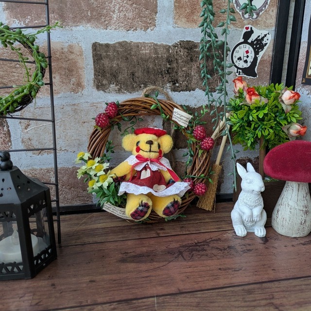 【作品について】 10センチサイズのミニチュアサイズテディベアをリースにアレンジ。 テディベアのメインカラー(黄色と赤)と同系色の装飾でバランスよく仕上げました。 壁に吊るす、又は壁に立てかけて飾ってください。 ※テディベアはリースに接着していますので取り外しはできません。 ※グルーガンで接着しています。 【サイズ】 リースのサイズ・・・直径約15cm テディベアの身長・・・約10cm(帽子部分はサイズに含みません) 目玉・・・プラスチックアイ ジョイント・・・ボタンジョイント 詰め綿・・・国産 簡単なラッピングをしてお届けしております。 リボンの色や素材はこちらにお任せください。 ★名前があると更に愛着がわきます。素敵な名前を付けてあげてください★ 作品はお支払い確認後、3営業日以内に出荷させていただきます。 基本的には宅急便でのお届けを予定しております。 moko* hand made bearは【世界にひとつだけのハンドメイドテディベア】がコンセプト。 他にはない個性的なテディベアを世に生み出し、年齢性別問わずたくさんのファンの方々に作品をお迎え頂いております。 ぬいぐるみには精神状態を落ち着かせ、癒しをもたらす効果があるとされています。 一人でも多くの方に癒やしをお届け出来ると嬉しいです。 【テディベアの取り扱いについて】 ・お手に触れる回数が増えると劣化の原因となります。 小さなパーツなど使用しておりますので、お子様の使用はくれぐれもご注意ください。 乳幼児の枕元には絶対に置かないようにしてください。 ・洗濯はお薦めしておりません。 万が一汚れた場合は固く絞ったタオルで拭いて自然乾燥させてください。 ・直射日光は布地の色あせやパーツが劣化や破損する原因となります。 特に室内温度が上昇する車内に飾る事はお薦め致しません。 おうちが決まる前のテディベアたちはホコリが付かないようガラスのショーケースに入れて保管しております。また、お客様のもとへお届けするまで定期的にケースの扉を開けて風通しを良くするなどしてお手入れしております。 テディベアをお迎え頂いた後も大切にお取り扱いいただけたら幸いです。 moko* hand made bearの作品は、以下のサイトでのみ販売しております。 オンラインショップBASE店 https://moko-bear.base.shop minne Creema メルカリShops
