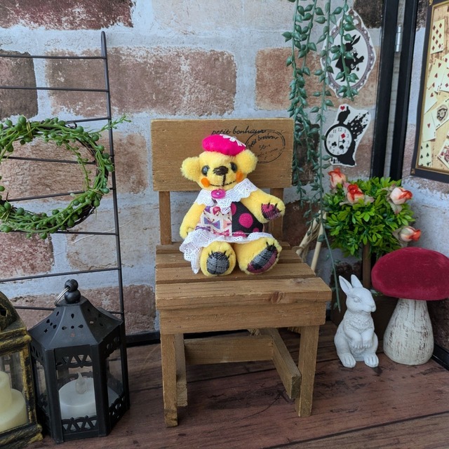 【作品について】 moko* hand made bearの中でも最小サイズとなる、 ミニチュアテディベア(10 cm) です。 製作過程での手仕事が非常に細やかで、10 cm〜35 cm のラインナップの中でも特に繊細な作品です。 小さいからこそ感じられる愛らしさを持ち、複数並べて飾るとさらに魅力が増します。 オプションで ブローチ加工(+500円)も承ります。ご注文時に有無をお選びください。 【サイズと仕様】 身長:約10cm(帽子は含みません) 目玉:プラスチックアイ ジョイント:ボタンジョイント(4ジョイント/手足が可動) ボディ素材:エコファー(アクリルファー) 詰め物:国産の綿 ※服の着せ替えはできません。 簡単なラッピングをしてお届けします。 【お手入れとご注意】 お手に触れる回数が増えると劣化の原因となります。 小さなパーツを使用しているため、お子様の使用はくれぐれもご注意ください。 乳幼児の枕元には絶対に置かないようにしてください。 洗濯はお薦めしておりません。万が一汚れた場合は固く絞ったタオルで拭き、自然乾燥させてください。 直射日光は布地の色あせやパーツの劣化・破損の原因となります。特に車内など高温になる場所での保管は避けてください。 おうちが決まる前のテディベアたちはホコリが付かないようガラスのショーケースに入れて保管しております。お客様のもとへお届けするまで定期的にケースの扉を開けて風通しを良くするなどしてお手入れしております。 【発送について】 作品はお支払い確認後、3営業日以内に出荷いたします。 発送方法、宅配業者はこちらにお任せください。 【メッセージ】 moko* hand made bearの作品は「世界にひとつだけのハンドメイドテディベア」をコンセプトに製作しています。他にはない個性的なテディベアを世に生み出し、年齢性別問わず多くのファンの方々にお迎えいただいております。 ぬいぐるみには精神状態を落ち着かせ、癒しをもたらす効果があるとされています。一人でも多くの方に癒やしをお届けできると嬉しいです。 名前があるとさらに愛着がわきます。素敵な名前を付けてあげてください。