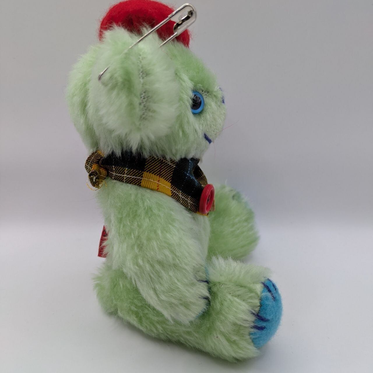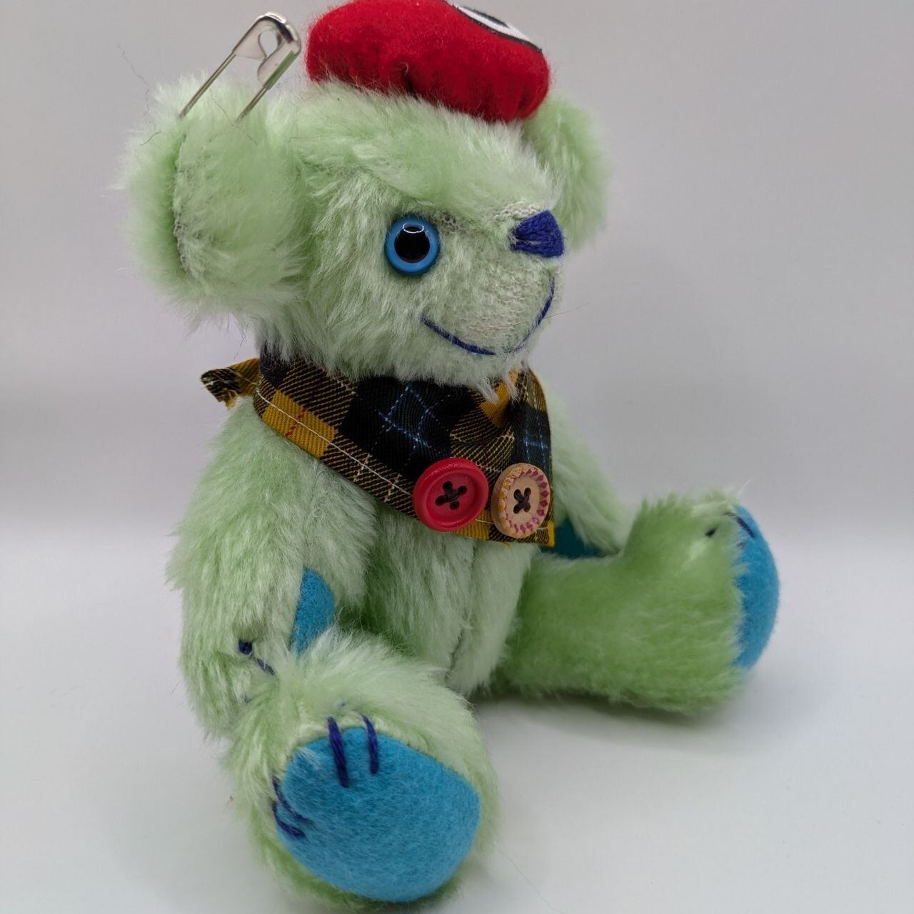 鮮やかなエメラルドグリーンのボディに、赤いベレー帽とチェック柄のスカーフを合わせたチャーミングなテディベアです。青い目と足裏がアクセントとなり、見れば見るほど愛着が湧く表情に仕上げました。