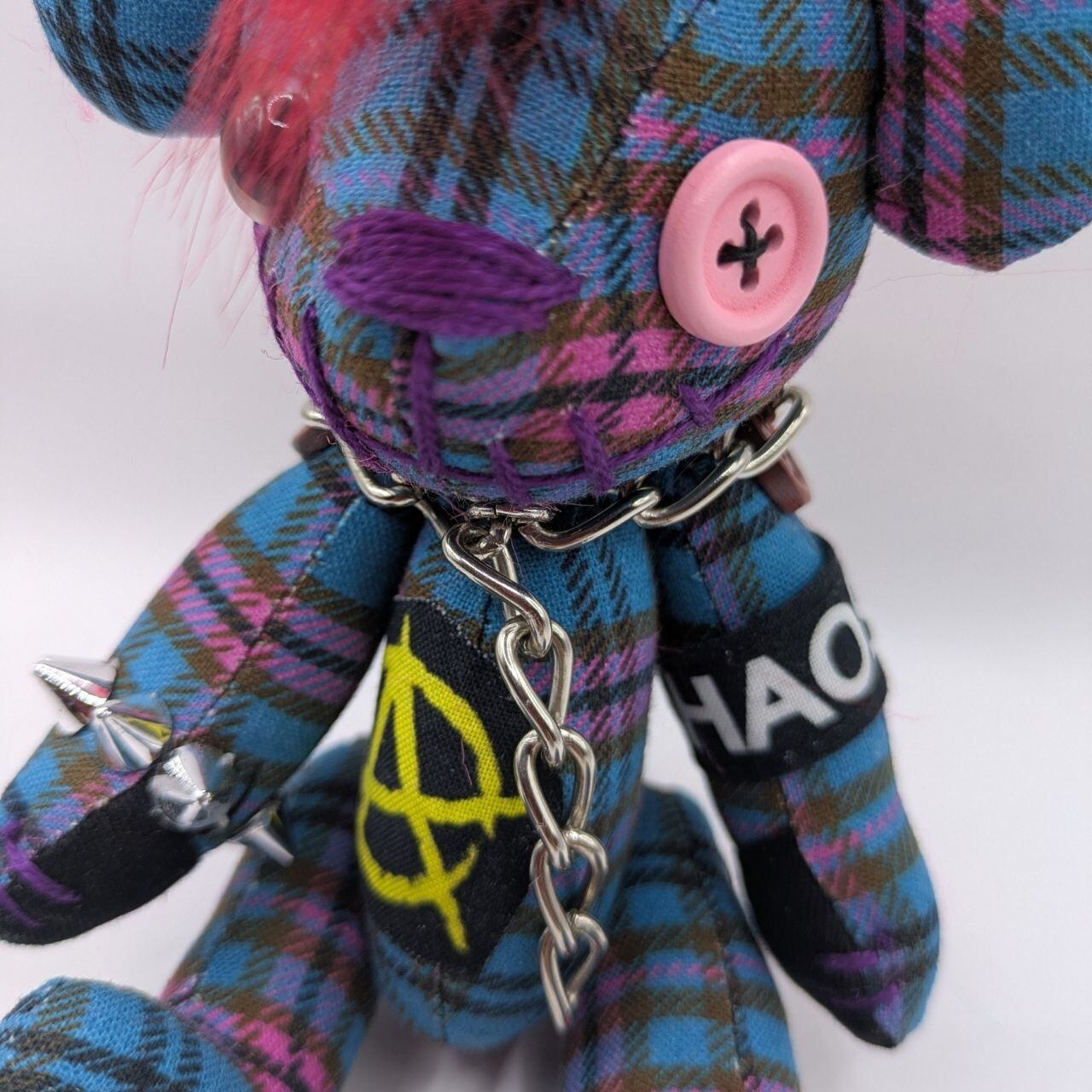 ホラーテイストと可愛さを融合させた、存在感たっぷりの一点物です。チェック柄の生地や片目ボタン、特注のワッペンなど、細部までこだわったオリジナルデザインが魅力です。