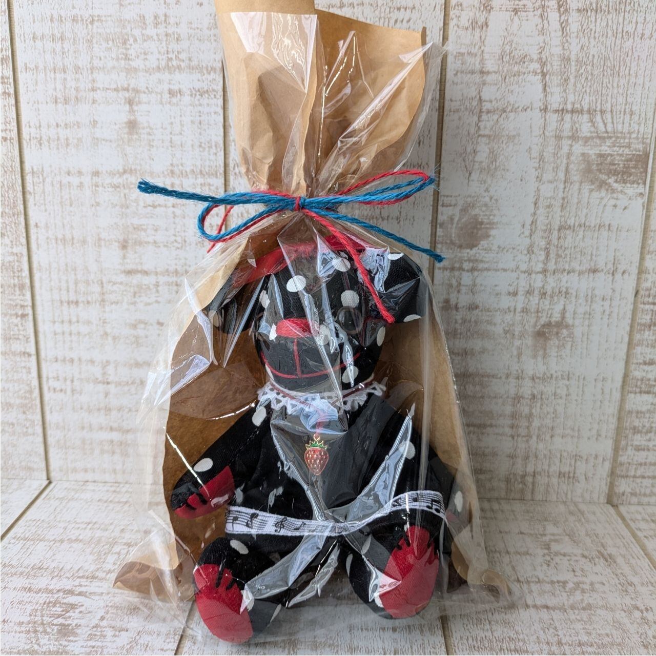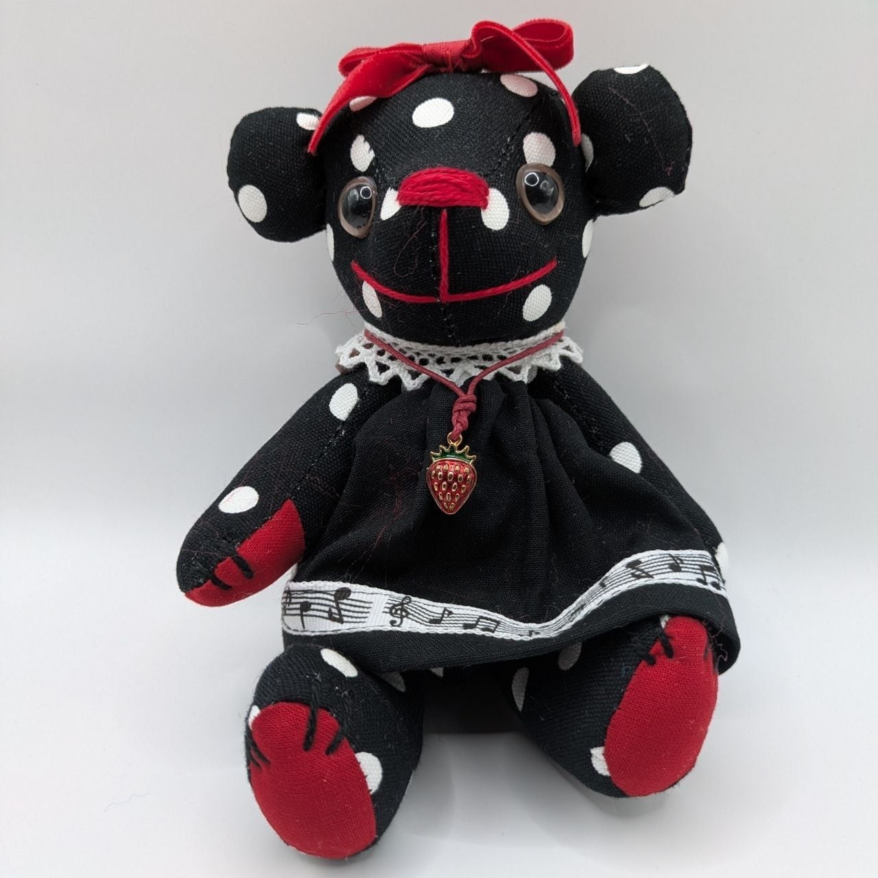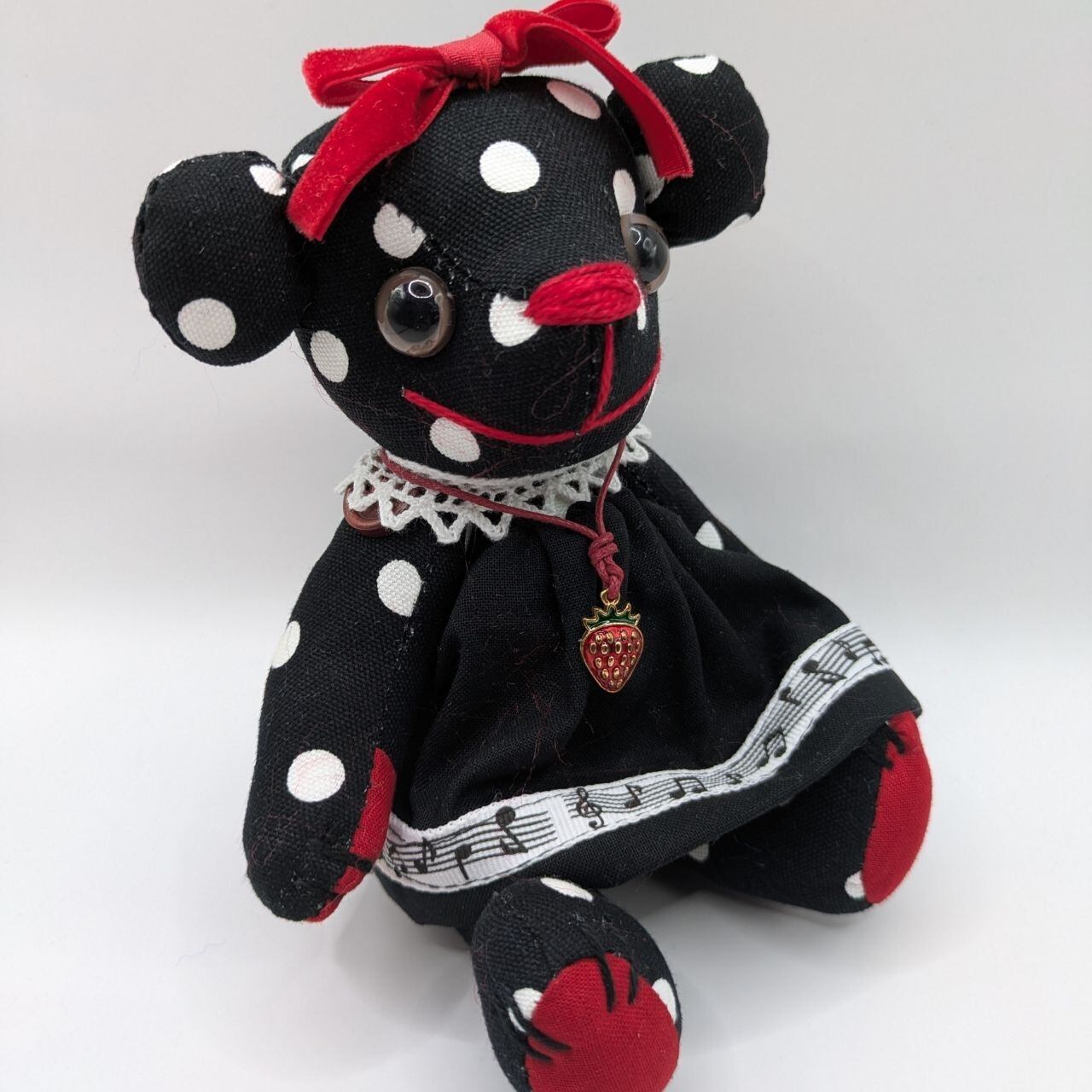 黒・赤・白のドット柄を基調に、音符柄のリボンやレース、いちごのチャームなど、細かいところまでこだわったデザインが特徴です。見ているだけで楽しくなるような、元気いっぱいのベアに仕上げました。