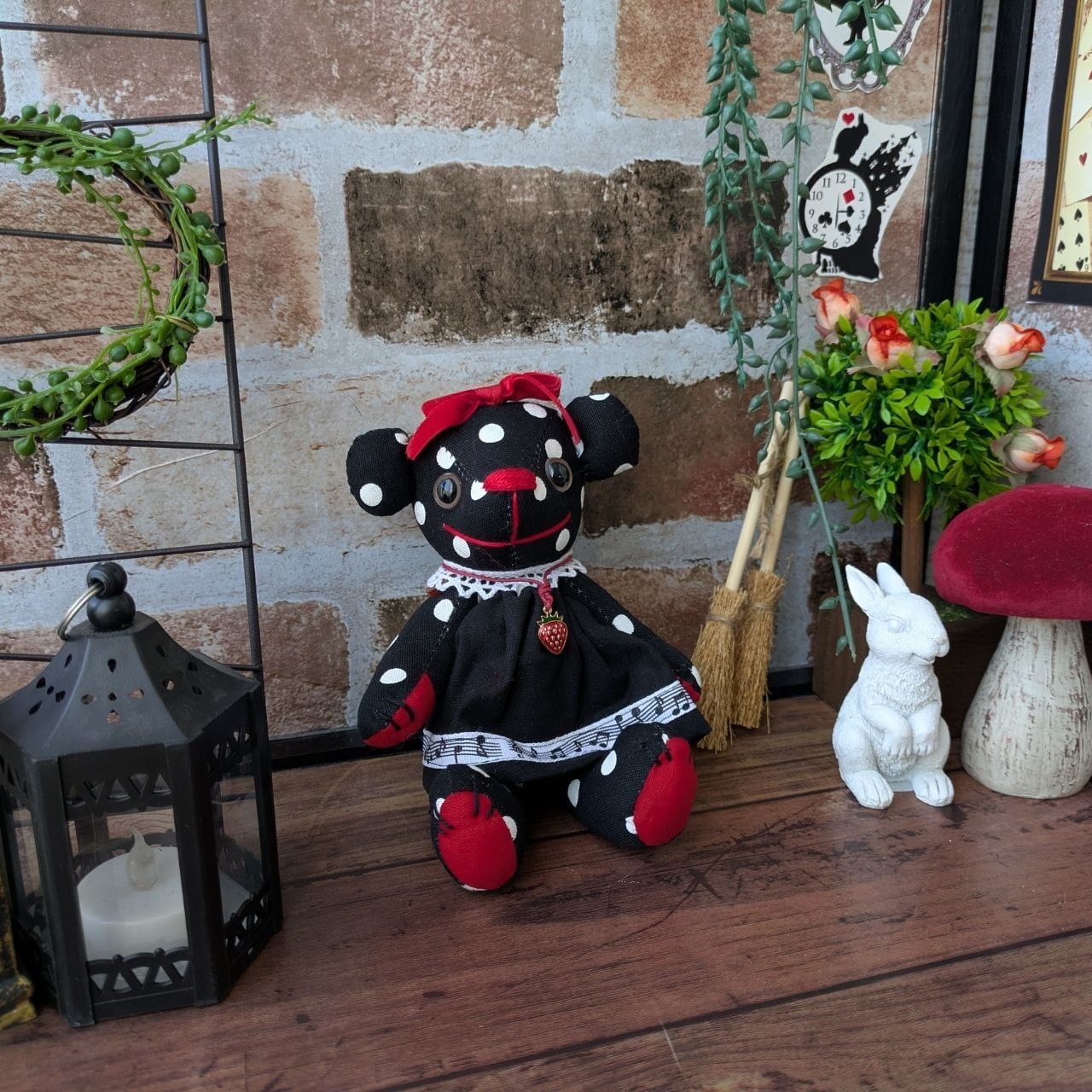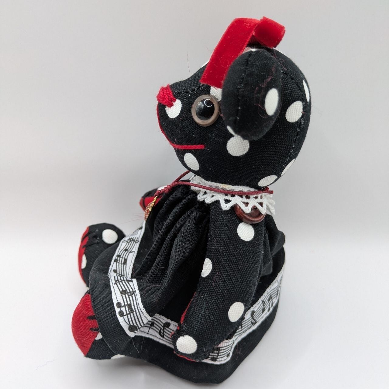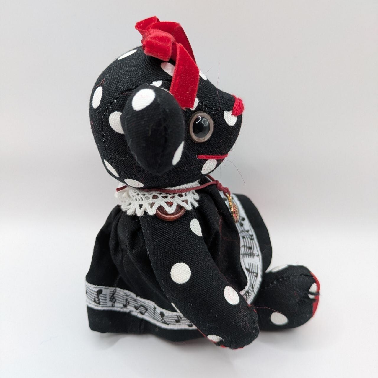 黒・赤・白のドット柄を基調に、音符柄のリボンやレース、いちごのチャームなど、細かいところまでこだわったデザインが特徴です。見ているだけで楽しくなるような、元気いっぱいのベアに仕上げました。