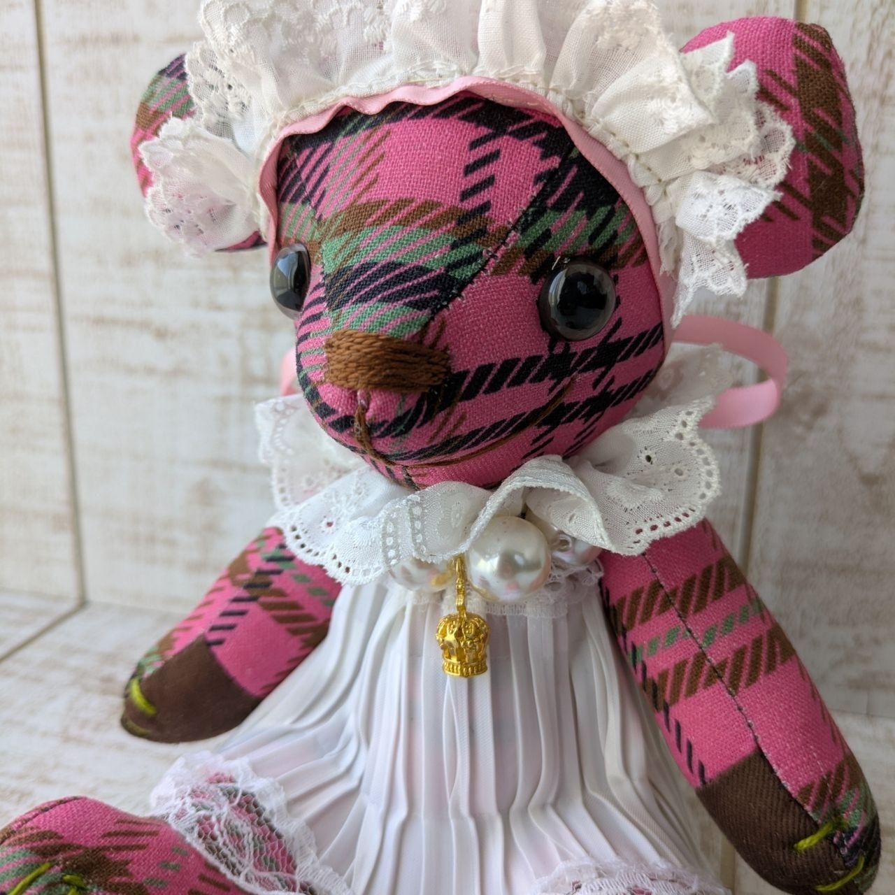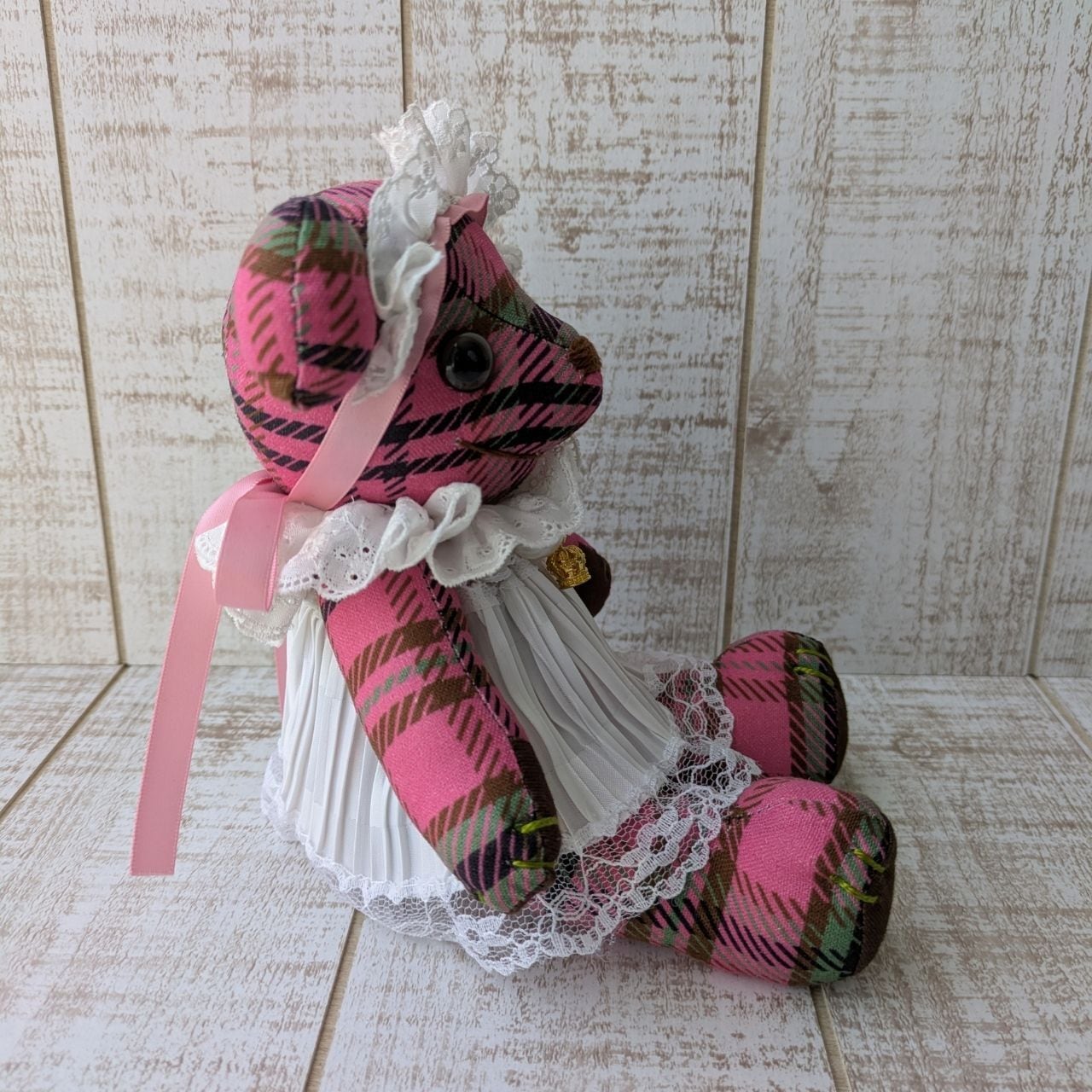 オリジナルチェック柄の布地で作ったテディベア。