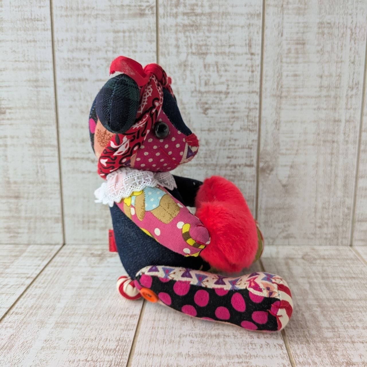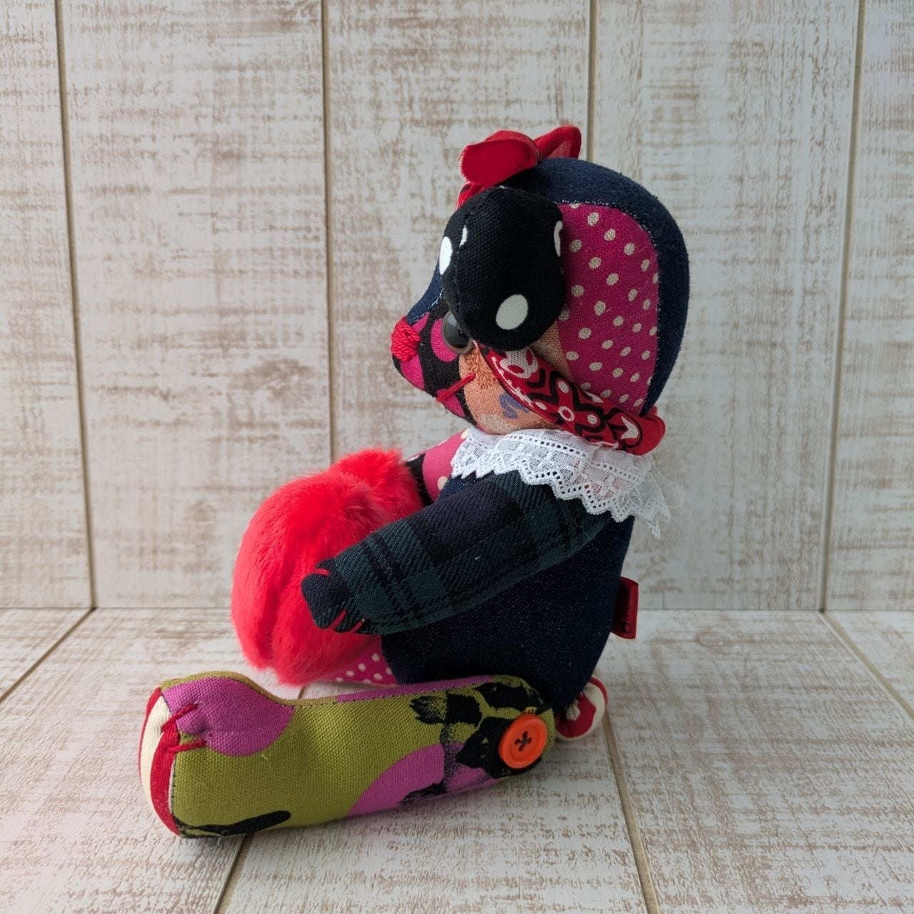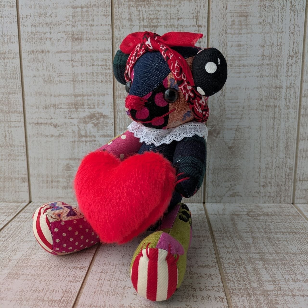 これまでコレクションしたお気に入りの布地とデニムを組み合わせて世界にひとつだけのテディベアが完成しました。