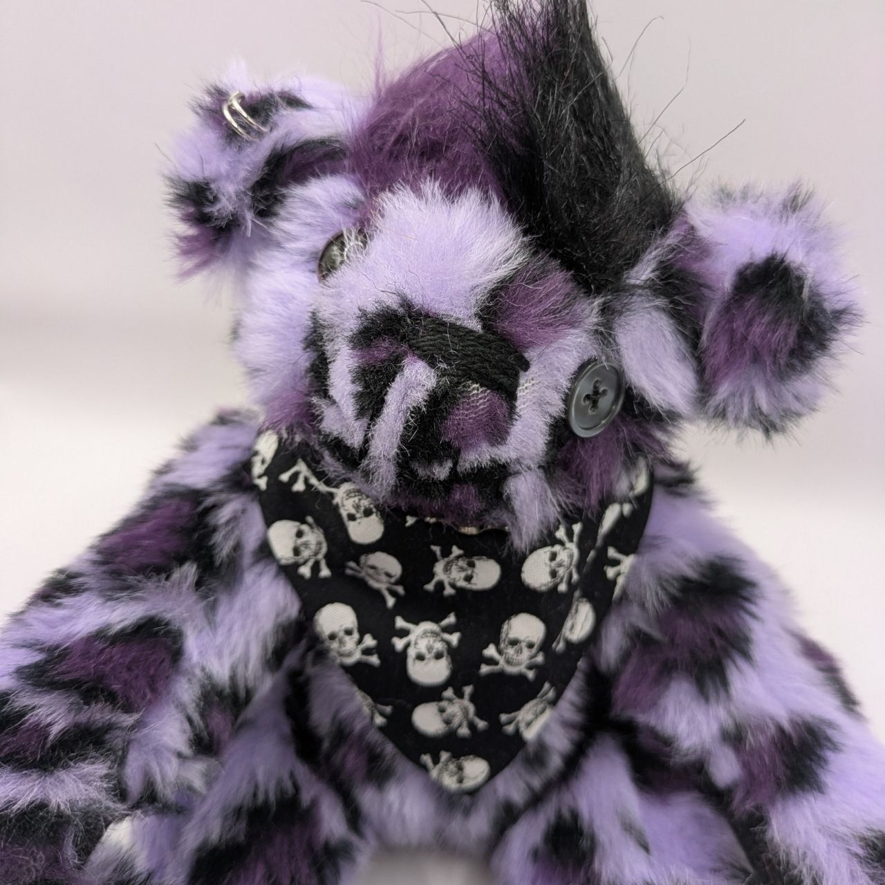 パープルのレオパード柄のファーで作られた個性的なテディベアです。